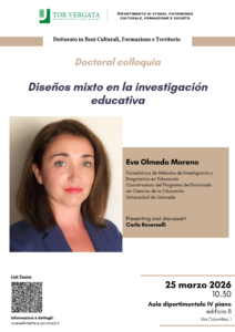 Mercoledì 25 marzo si terrà una lezione dottorale nell’ambito del Dottorato di ricerca in Beni culturali, Formazione e Territorio. La lezione, dal titolo Diseños mixto en la investigación educativa, sarà tenuta da Eva Olmedo Moreno.